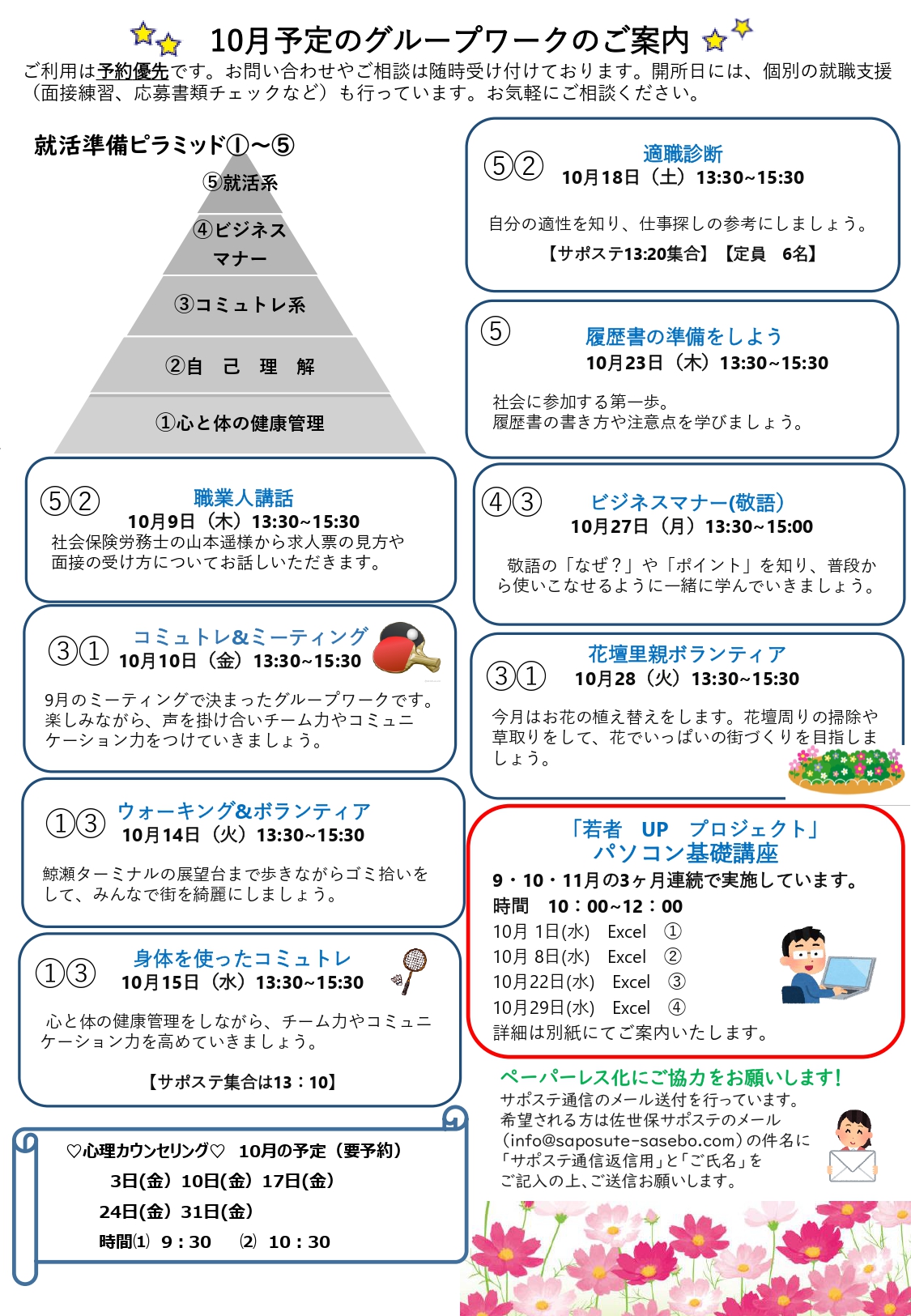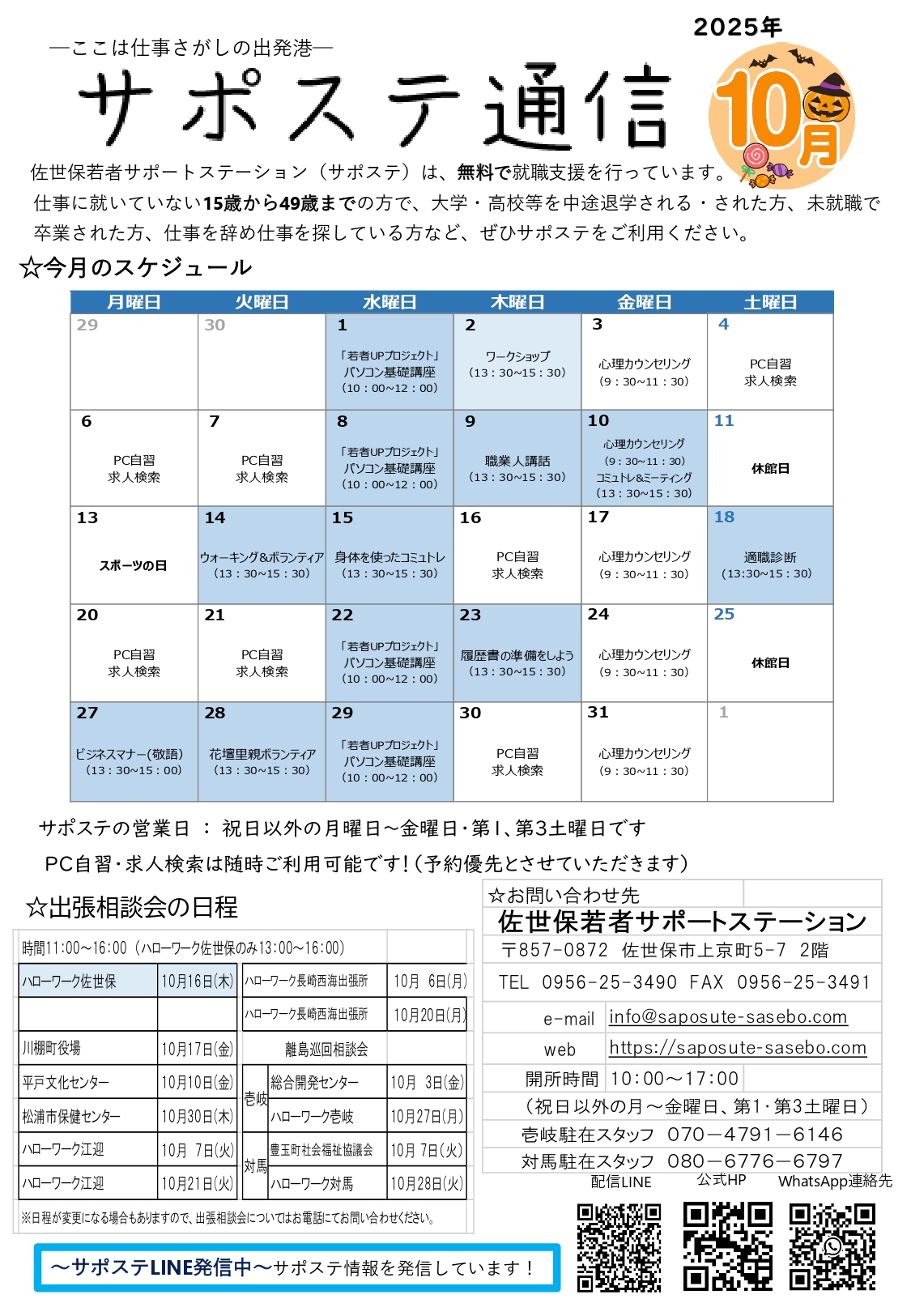 佐世保サポステの月間カレンダーです。各種サポートプログラムの開催予定をご確認いただけます。
